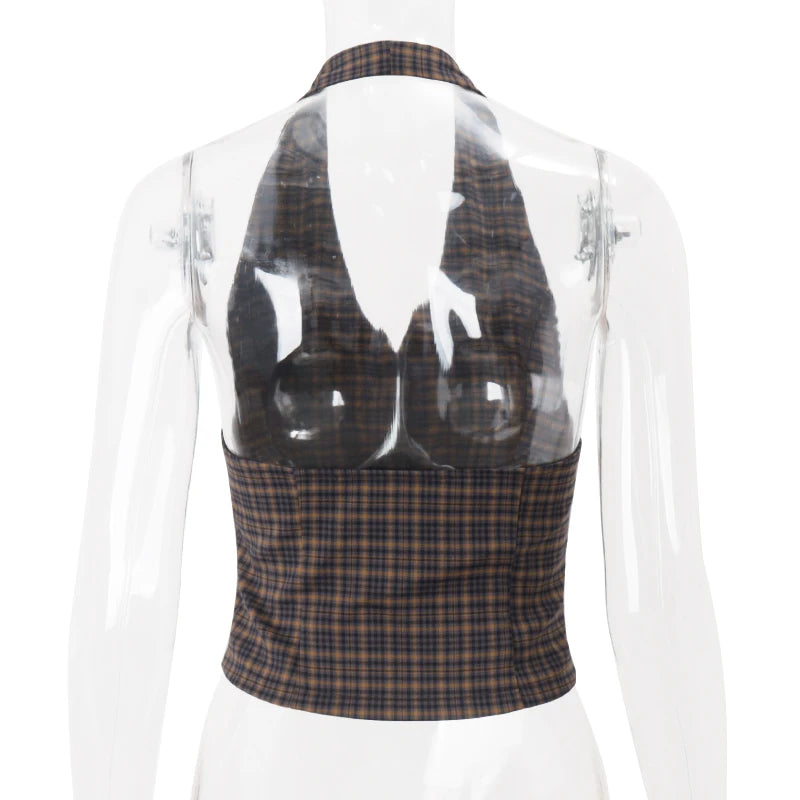 A trendy layering piece featuring a chic brown & navy plaid pattern. Designed in a slim-fit cut that flatters your silhouette while adding a vintage-inspired edge to any outfit.