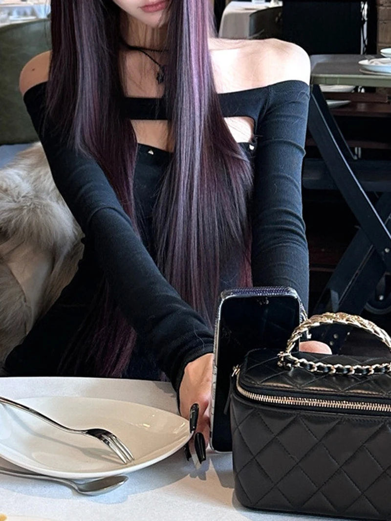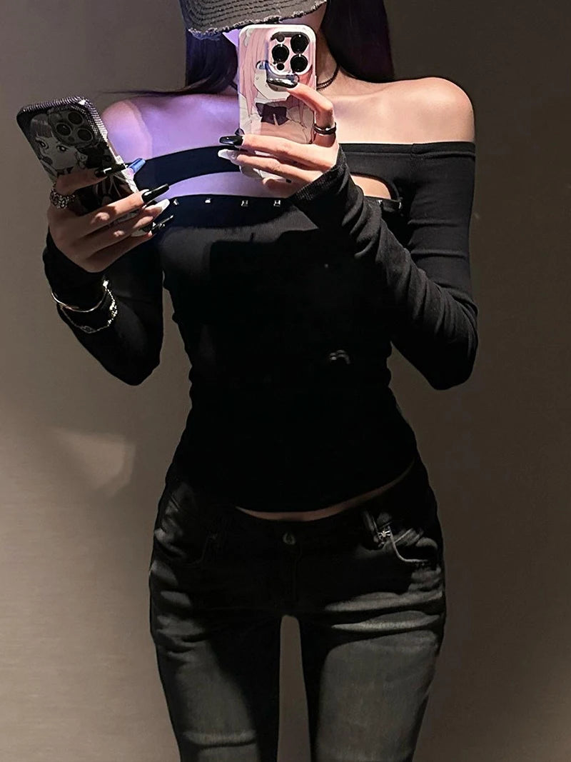 Make a bold statement with this black off-shoulder mini dress, designed to turn heads. Featuring a striking chest cutout accented with metallic stud details, this dress effortlessly blends elegance with an edgy vibe.